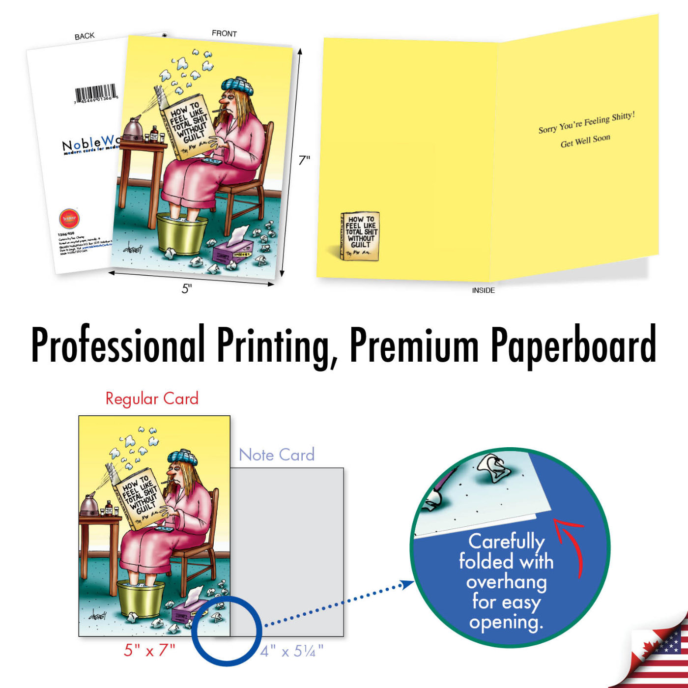 Missing work or missing out on spending time with friends and family because of illness can make one feel guilty. Fortunately, NobleWorks Cards has published the 'How To Feel Like Total Shit Without Guilt' book, as illustrated on this Funny Get Well Card. Brew up a hot beverage, break out the meds, pop the tissues, soak feet and head, and read all about feeling like total shit without feeling guilty. When the sick recipient of this colorful, hilarious card reads it, they'll be instantly feeling both better and guilt-free.