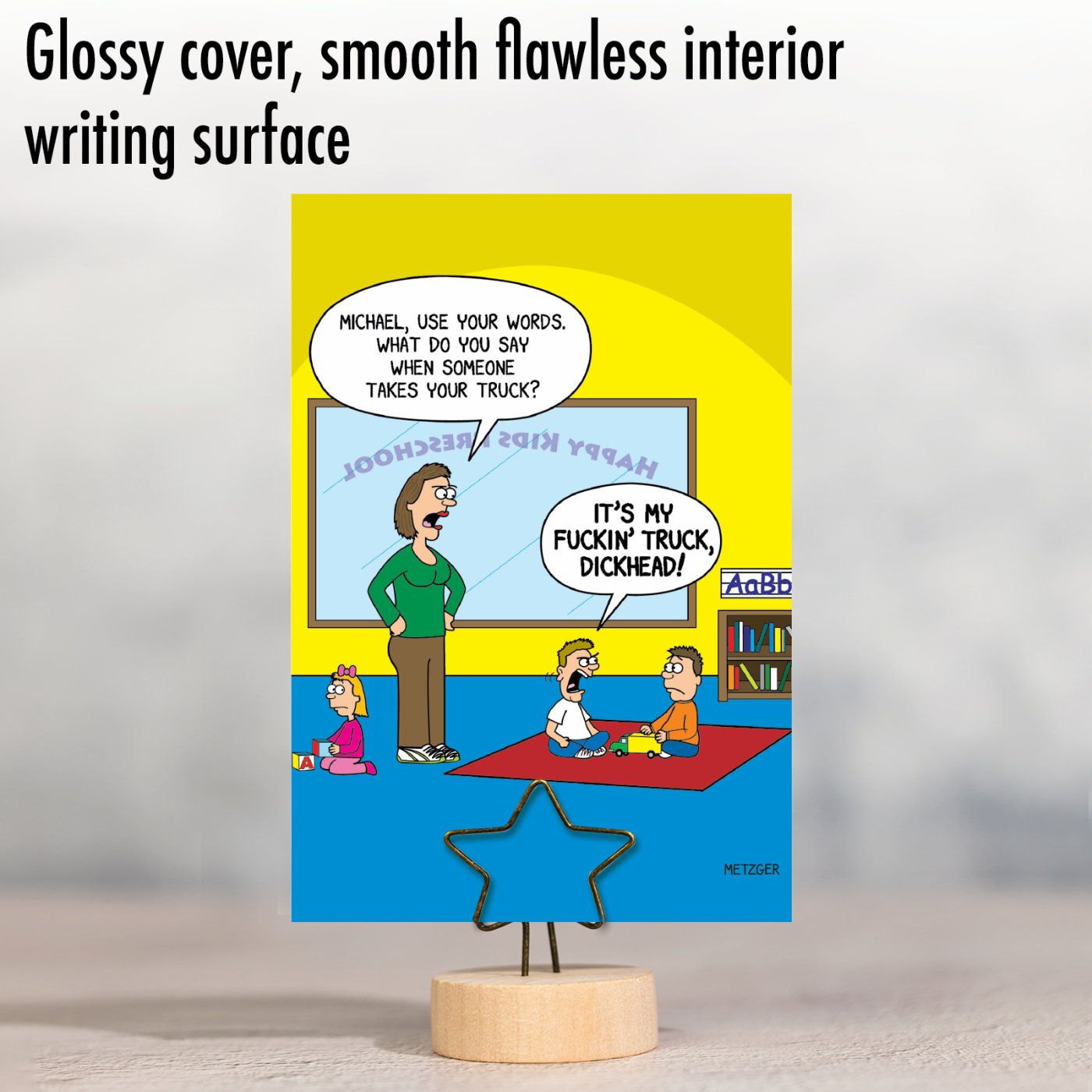 This laugh-out-loud hilarious greeting card is blank on the inside, making it perfect to customize your message for any occasion. The cover artwork portrays a scene where a mother is telling her son to verbally stand up for himself. The boy stands up for himself, probably in a way mom wouldn't approve of, well, let's hope not. "That's my fin' truck, dickhead" the boy says. The other boy's eyes light up and can't believe what he just heard. Makes for a pretty funny greeting card, that's for sure!