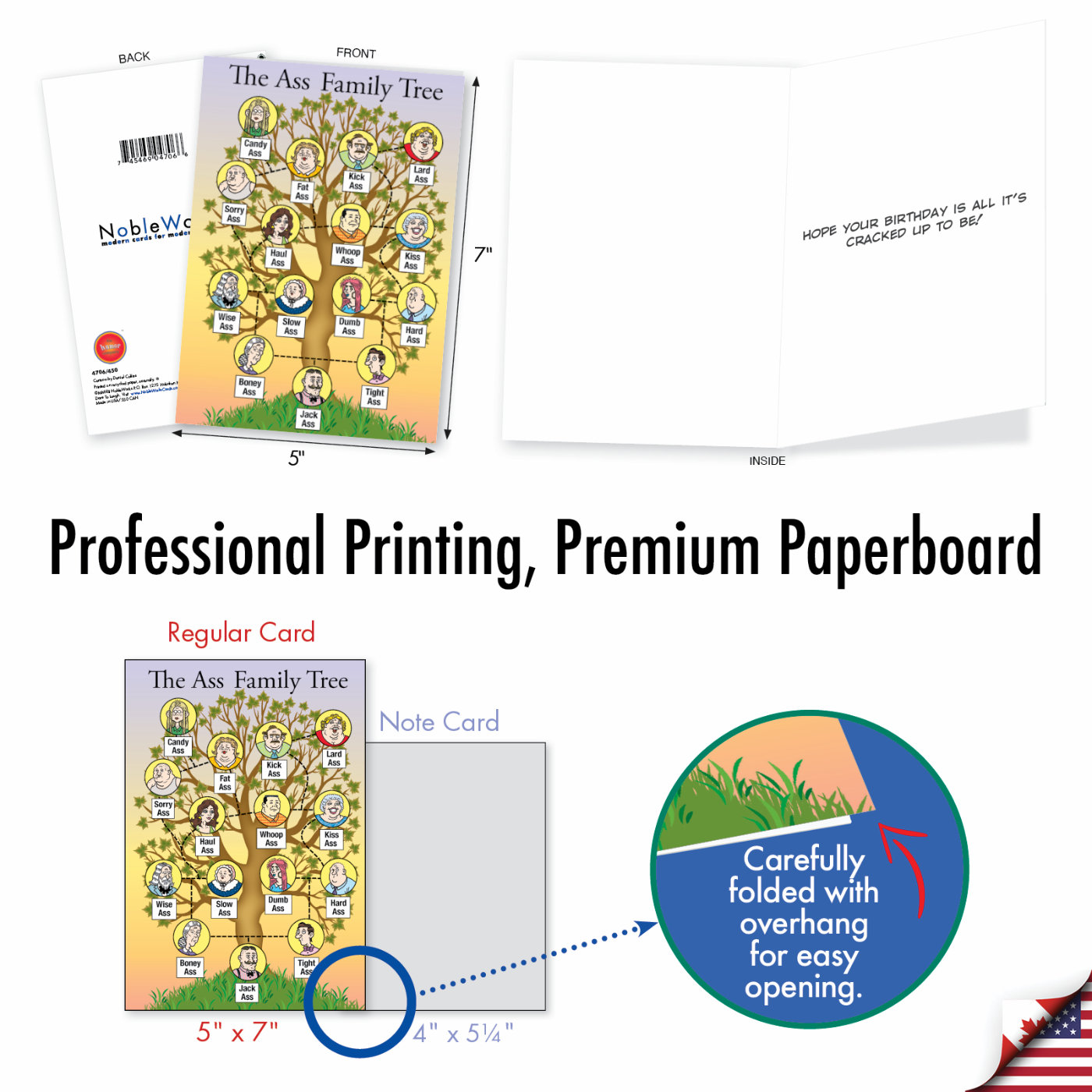 Tracing your ancestral roots is all the rage right now. Butt … if your genealogy includes a branch on the "The Ass Family Tree," you may not want to advertise that fact. So, let NobleWorks and cartoonist Daniel Collins plant the seed of hilarious Asinine descendance on a friend or coworker you know who is celebrating a Birthday, using the colorfully, cleverly and comically illustrated, captioned and researched birth anniversary card uncovered and revealed right here. It's bottoms up, big time, to that rump of a kind woman or man turning another year older and hysterically heritage wiser, with no skin off your ass!