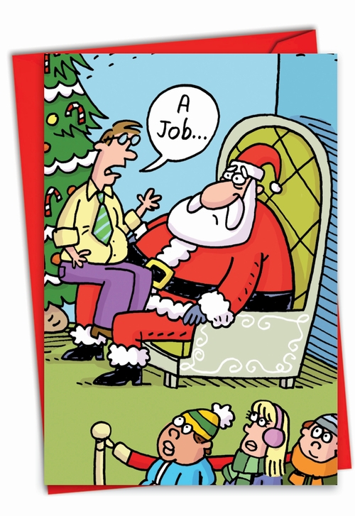 Tough economic times call for drastic measures so don’t be surprised if you see adults making wishes to Santa Claus over the holidays. This colorful greeting card by Stan Makowski shows that some adults may be wishing for more practical gifts this year. This is the perfect card for your friends or family members who consider themselves “go-getters.”