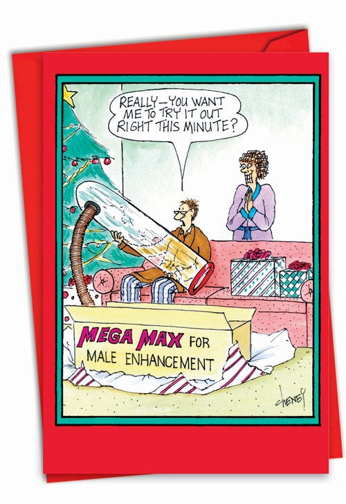 Enhance your holiday joy and pump up your seasonal spirit with this provocative Christmas card. Illustrated by humorist Tom Cheney, his funny Xmas pictures are usually shocking, irreverent and risqué, but they are also hilarious. Unlike other funny Christmas pics, this card celebrates the gift that keeps on giving, but perhaps with unrealistic expectations. A funny gift for the man of your house, this funny card may go over better than actually giving male enhancements.