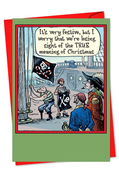 The commercialization of Christmas has long been debated and we're constantly inundated by questions about the true meaning of the holidays and whether our children understand and appreciate it or if they're growing up to become horrible brats. That's the basic sentiment behind Dan Piraro's Losing Sight holiday card with pirates, which contains a pretty clean joke most anyone can enjoy.