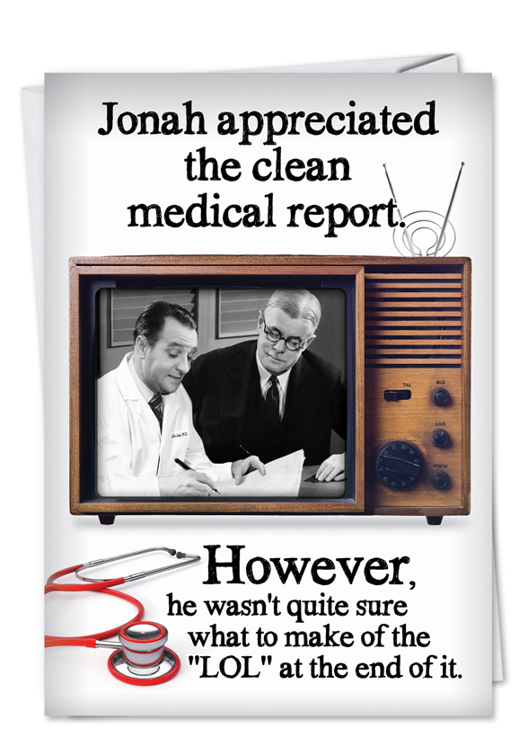 There's definitely something funny about this medical report card! Incorporating vintage, black and white television physician and patient imagery, and a modern day computer acronym, the hilarious Birthday greeting will be just what the doctor ordered for making anybody's birth anniversary even more joyous and happy. Because a good cardboard card dose or shot of hilarity always pumps up a Birthday party!