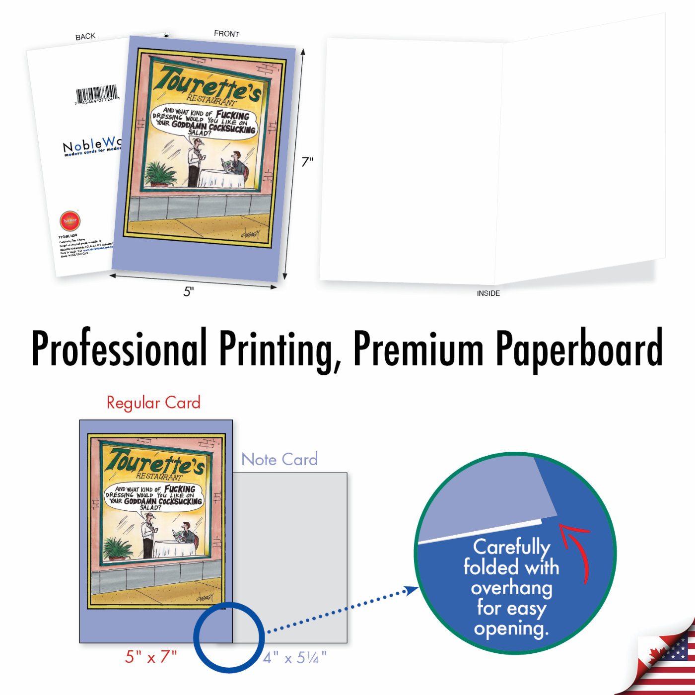 It takes a sick sense of humor to laugh at Tourette's sufferers. Fortunately, there are some sick people in the world, with some of them working right here at NobleWorks Cards. This funny, naughty, colorful cartoon card contains language that is appropriate for adults only, so give the card wisely. Those who are easily offended will probably not be too impressed on the outside, but they may chuckle on the inside.