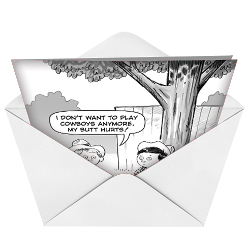 There's nothing like some good old-fashioned filth to help ring in another year, is there? And that's exactly what you get with this Playing Cowboys funny birthday card from Daniel Collins. These young boys learned a powerful and perhaps relatable lesson that you'll laugh about with your friends.