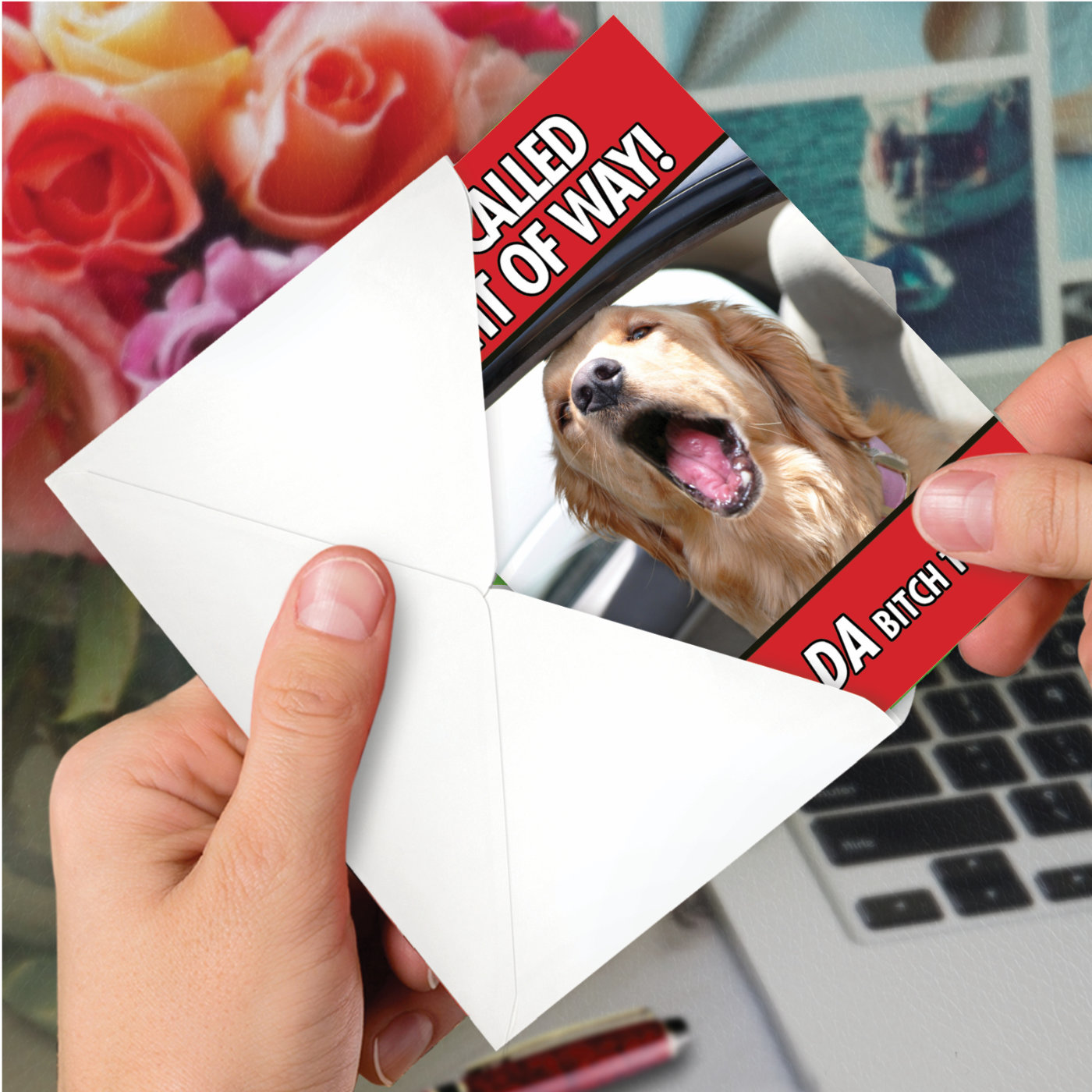 Dogs absolutely love riding in cars, don't they? Especially when they can mouth or bark off to other vehicles on the road. Such as the golden lab hysterically pictured yowling out some good advice to another driver on this funny, furry, freeway All Occasions card. If you have some two legged friends, family members and colleagues who are automobile and pet canine owners, or who could just use a playful pooch laugh, then this is the hilarious, freewheeling, highway hound greeting to gift them.