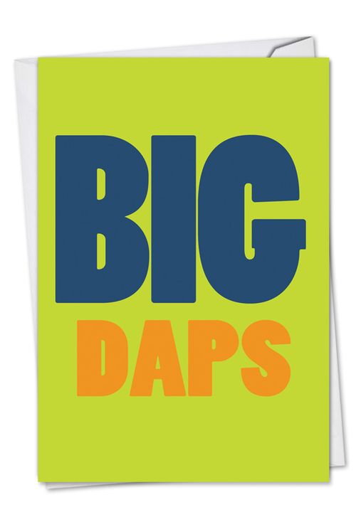 This is one big paper fist-bump of a card! 'BIG DAPS' is spelled out in large blue and orange letters on a vivid green background on the front, with a bright orange background on the inside of the card awaiting any additional message you care to send. A great card to give someone who's achieved something tremendous and is heartily deserving of BIG DAPS!