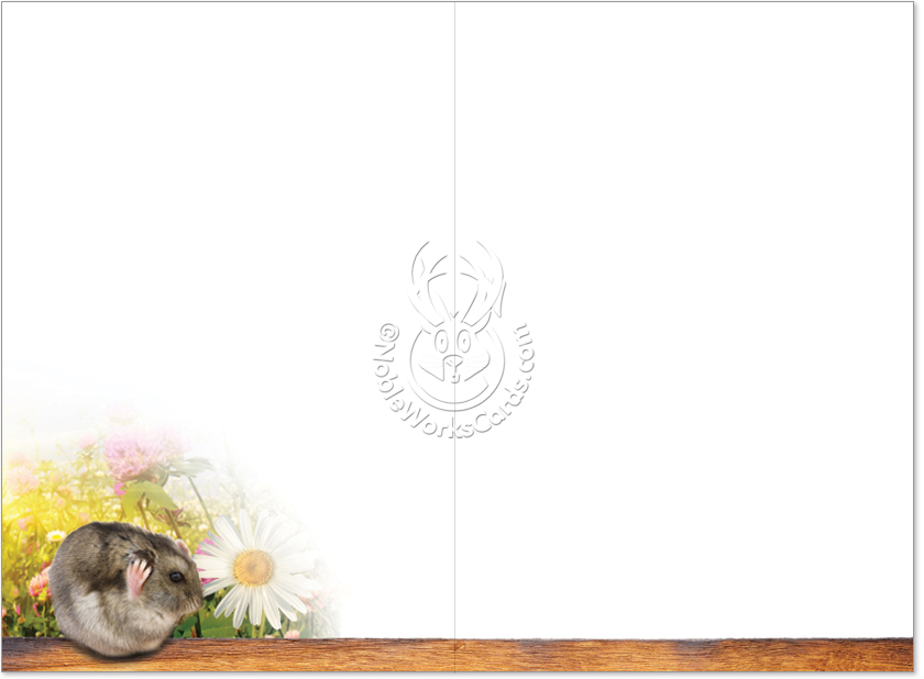 The hamster has had enough of all the yak yak! The adorable little pet creature is putting its paws to its ears to tune out the chatter, while sitting on a knotty fence board in a flower filled sunny field; as creatively and humorously pictured outside and inside of this hilarious, high spirited All Occasions card. It's all in good furry fun and animal inspired amusement to wish someone special Congratulations on a New Baby, New Home or New Job, or to send out your Friendship, Good Luck, Graduation, Miss You or Thank You sentiments, with a minimum of yadda yadda yadda and a whole lot of a good cheer.