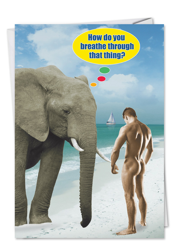 Elephants know something about longevity, in more ways (and body parts) than one. So, when a pachyderm is laughing at a guy's male appendage, that human may figure he's on the short end of the stick (or trunk), so to speak. But any of your men, women or animal friends, relatives and workmates celebrating a Birthday will be definitely trumpeting joy and delight when you gift them this humorous man and beast beach Birthday joke card. Featuring colorful nudity, wildlife and a sailboat, the hilarious, tusk and penis Birthday greeting is long on laughter, will engorge anyone's Birthday party with great hilarity and good feeling. You can assuredly breathe easy on that count.