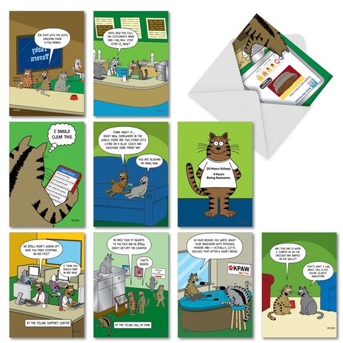 Can cats 'ham' it up? On this collection of ten Birthday Joke Cards they sure do! Cartoon kitties knock back a few at a bar, push cups on a coffee counter, click onto food blogs, latch onto some mind-blowing 'catnip,' field calls at a feline support center, visit the feline hall of fame, and check out their cellphones, on these colorful, hilarious cards. Complete with cat-printed birthday punch lines on all of the cards' insides. Being downright catty about someone else's birthday never came out so feline fine.