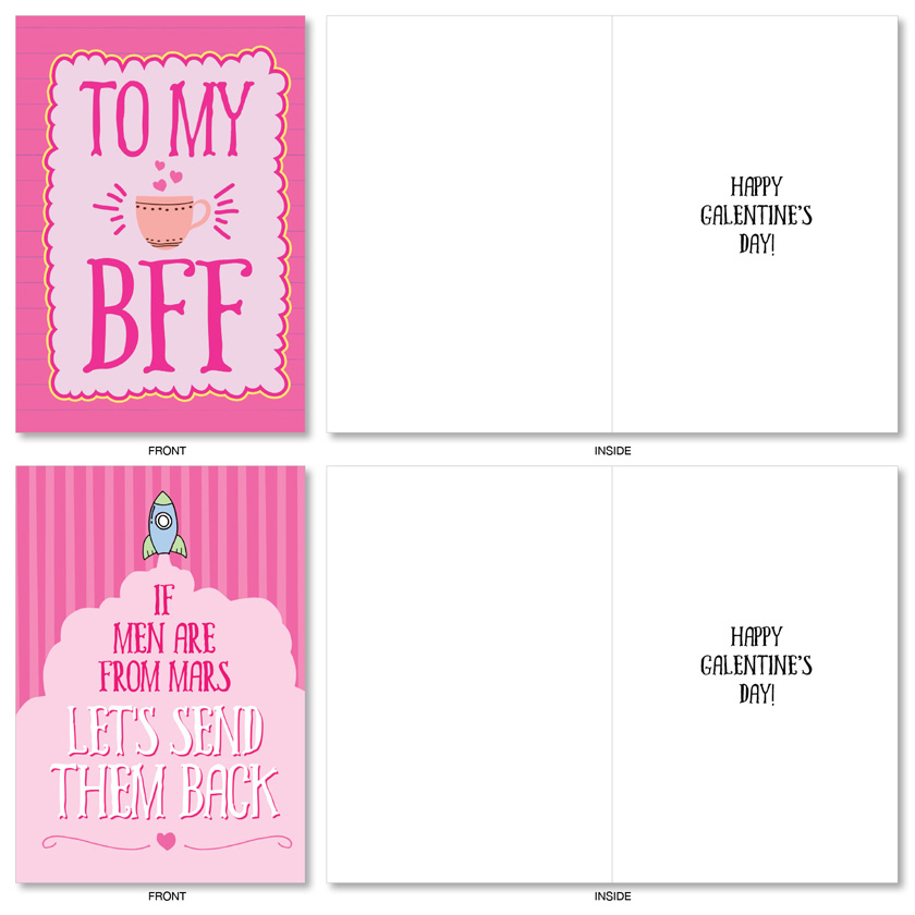 First, there was Festivus for the rest of us; now, there's Galentine's Day for females only. This cute, charming, woman-centric, alternative V-Day collection features lovely and humorous missives of fabulous femme fantasticness done up in artful, pulsating pinks and reds, and purring and pouring with sparkling wine glasses, hearts, kittycats, coffee cups, spaceships, crowns, ribbons, dots, patterns, balloons, confetti and hilarious verbiage. Because: girls just wanna have friendly feminine fun on G-Day.