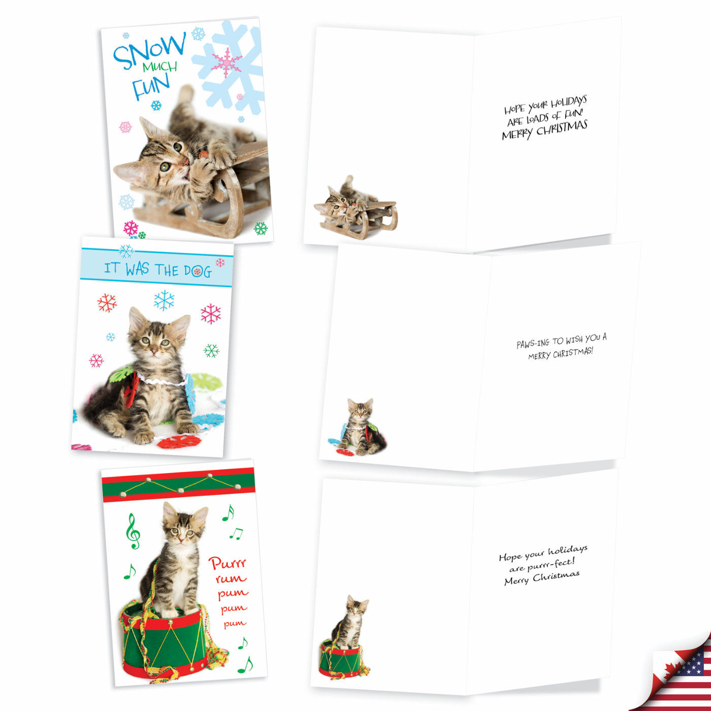 All your adorable Xmas kitty greeting card needs will be furrily fulfilled with this ten card collection of gray, white, brown and black and white baby felines getting into all kinds of lovely and laughable Yuletide mischief. Anybody gifted one of these Noel cat caper cards will be feeling the warm and fuzzy Holiday spirit, too.