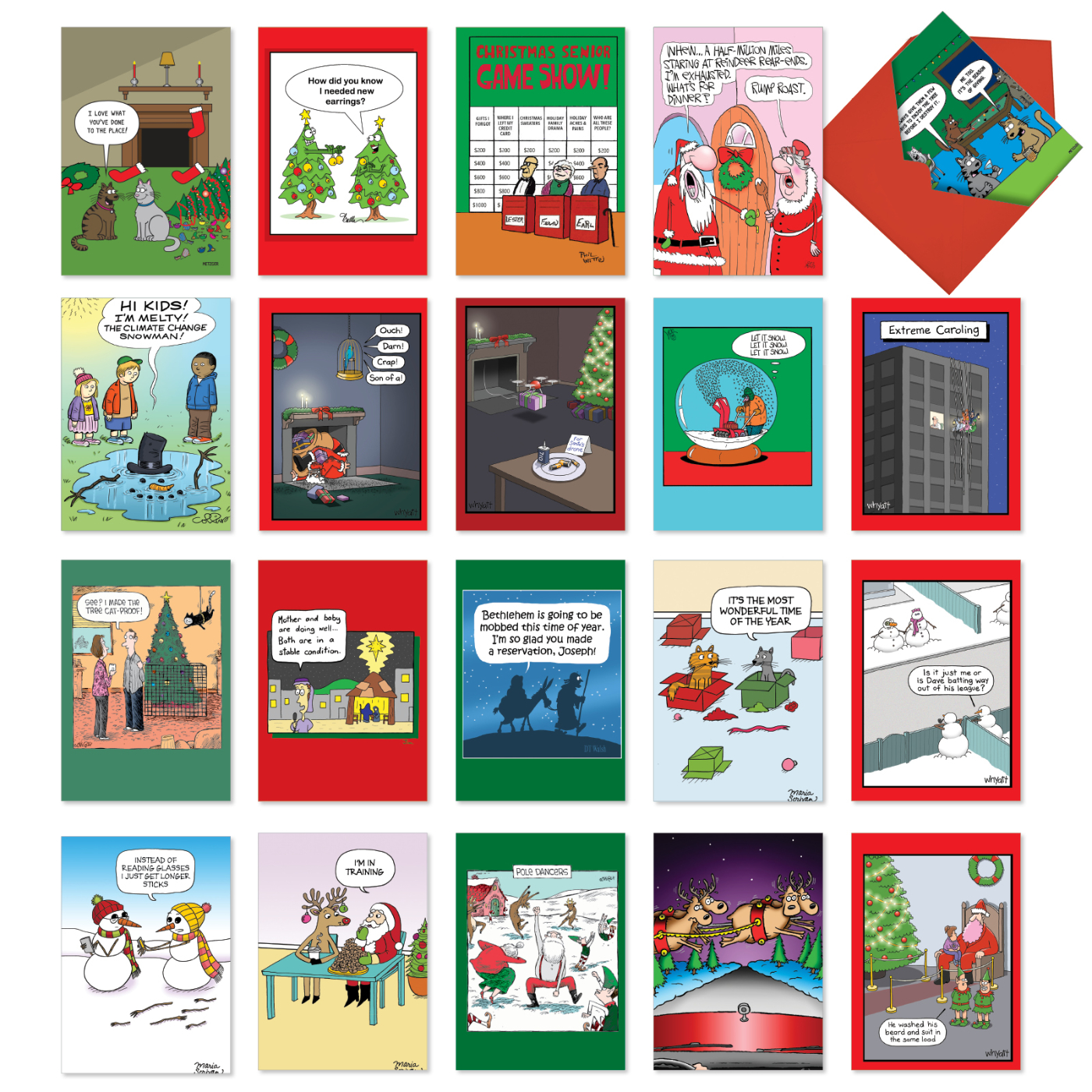 What's red and green and covered in laughter? The twenty hilarious Holiday cards in the seasonally hued assortment available right here, of course! There's a funny festive Yuletide greeting for everyone on your Holidays card list in this vast, varied and very amusing and appealing collection; with playful pussycats, resourceful snowmen and women, sassy elves, extreme carolers and exhaustively happy Santas, to highlight just some. You and your Noel card worthy friends, family members and coworkers will never be short of Holiday good cheer, great chuckles and seasonal joyous jokes when you purchase this colorful, clever and humorous, yukking wonderful, Yuletide greetings grouping.