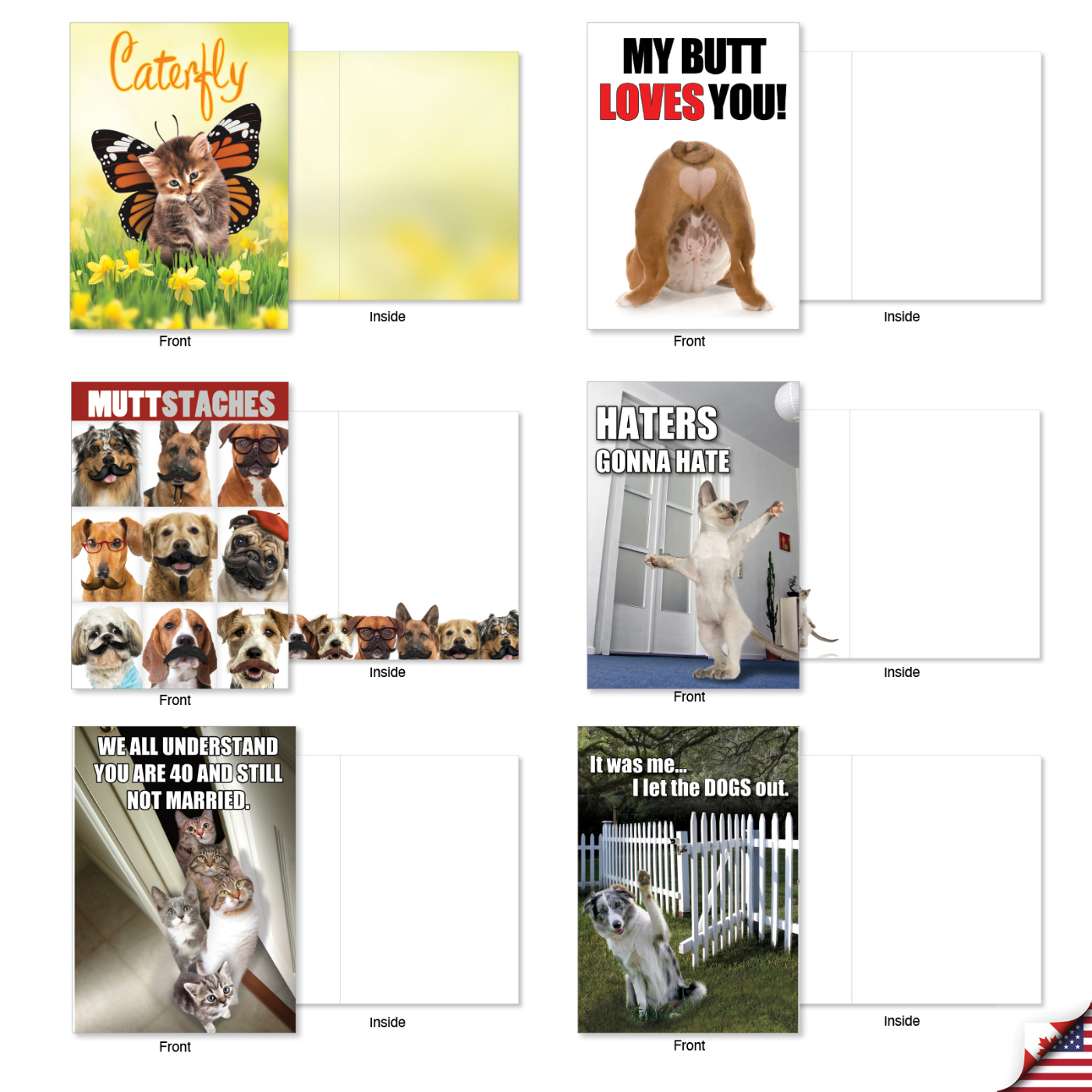 Do you have any dog or kitty owning and loving friends, family members and coworkers who could use a comic canine or cat All Occasions card to cheer them up if they're maybe feeling ruff or not feline so fine? Then paw up the high spirited and hilarious pussycat and pooch collection of Blank Inside greetings available here. Even if those people you want to give a doggone good laugh or catty chuckle to aren't pet parents/companions or fanciers, rest assured "everyone" you gift one of these hairy, humorous cards from this furry, four legged and very funny twenty greetings collection will be barking mirth and purring delight courtesy of your hilarious generosity and goodwill. Featuring hijinks happy bulldogs, labs, German shepherds, Pomeranians, beagles, kittens and tabby, calico and Persian cats, you'll be bringing home and unleashing the good natured hilarity on those people you cherish for any reason or occasion you choose, with no housebreaking training required.
