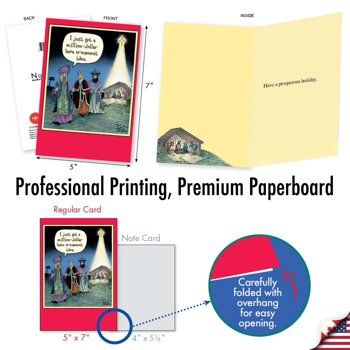 In the Bizarro cartoon world, Christmas is just a little bit different, and a whole lot funnier! Comic artist Dan Piraro's one of a kind and loads of laughter vision of the Holidays is showcased for the enjoyment of all those on your Season's Greetings list in the twenty garrulously goodtime Xmas cards assortment available here. All the Noel icons of the season get the brilliantly twisted Bizarro treatment on these hysterical greetings; like couch surfing Santa Clauses, carrot felled snowmen, sock puppet present recipients, cynical shoppers and axe grinding employees. To highlight just some of the amusingly and amazingly Bizarro Christmas cards available here to make anybody's Yuletide truly and memorably mirthful.
