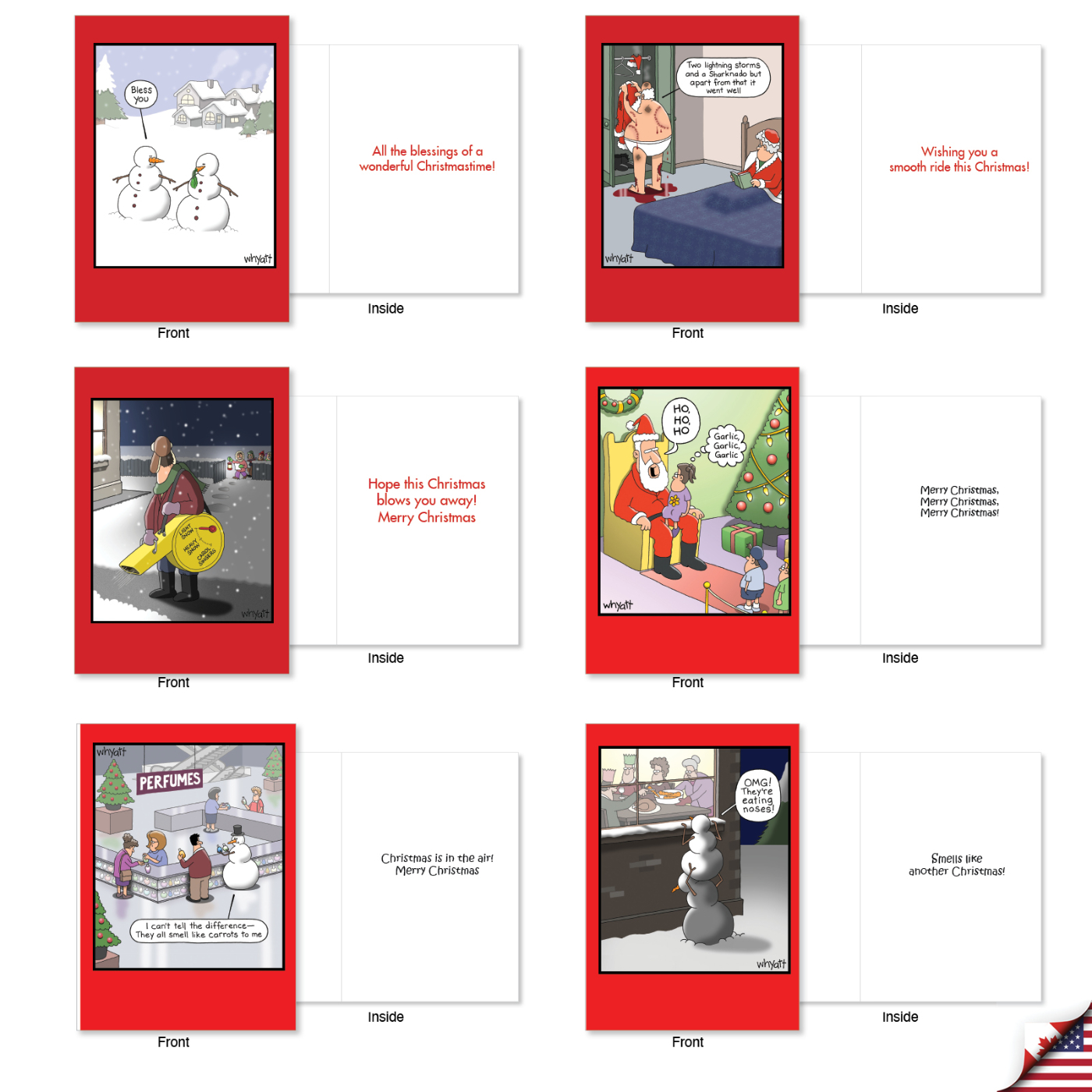 It's a wonderful, witty and wacky Whyatt Christmas! Courtesy of the twenty hilarious Happy Holiday cards created by cartoonist Tim Whyatt and NobleWorks and available right here for wise purchase and winning gifting. Any of those especially festive friends, family members and coworkers on your season's greetings list, with fine senses of humor and astute appreciation for comical drawing, will be made even more merry, mirthful and bright when you send them any of the clever, colorful and hysterical cards from this joyously joking assortment. Snowmen, Santa Claus, reindeer, Jesus Christ, aliens, dogs and nudity are all funnily featured in the winter Whyatt wonderland of garrulous and gutbusting Noel greetings collection.