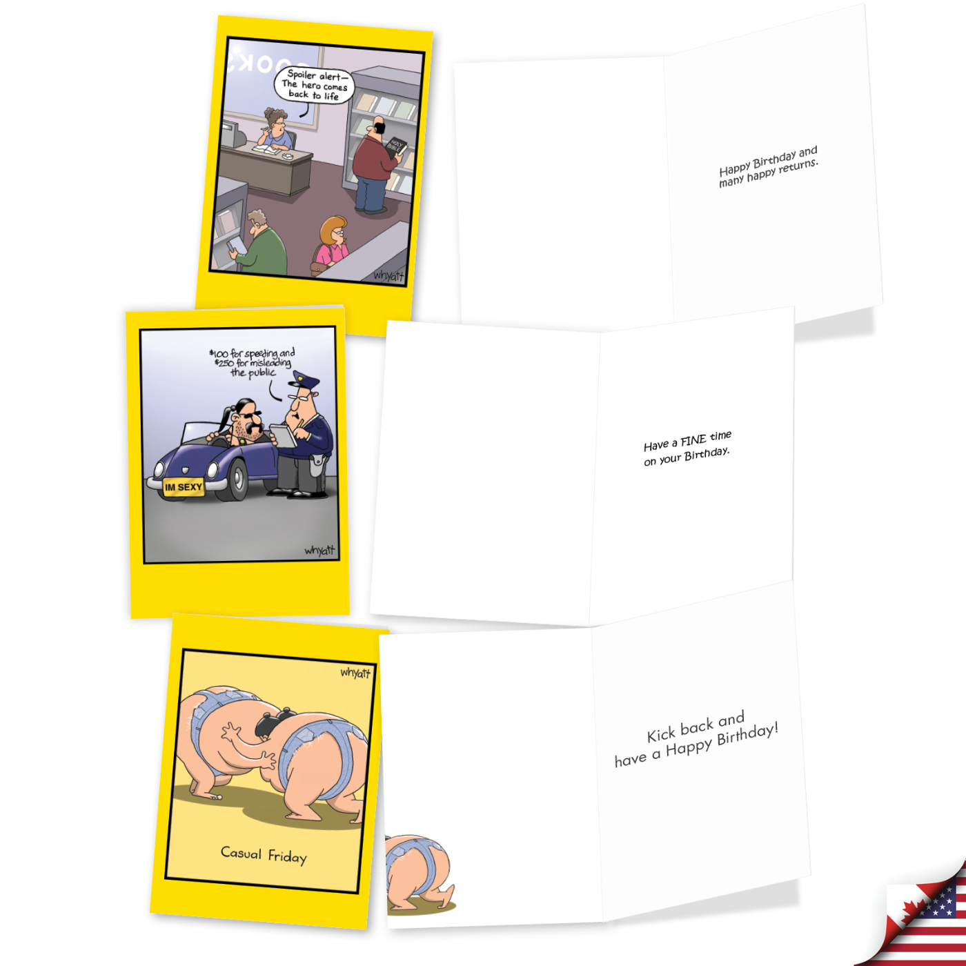 Birthdays are always way better with a wacky and wonderful Wyhatt card! So, for the total amusement and absolute entertainment of all those friends, relatives and workmates of yours who are turning another year older: the twenty greetings, ten design Tim Whyatt amazing assortment of awesomely hilarious Birthday cards available here! Lots of laughs and copious chuckles will be served up along with the thin slices of Birthday cake when you dole out any one of these colorful, comic, clever and chortlingly captivating hilarious greetings to anybody you know celebrating a birth anniversary. That utterly unique and epically hysterical Whyatt humor is cartoonishly pictured and mirthfully captioned via crocodiles, emoticons, office workers, librarians, sumo wrestlers, peacocks, sheepdogs, speeders and granny trampoline voyeurs, for the special enjoyment of all those aging another annum.