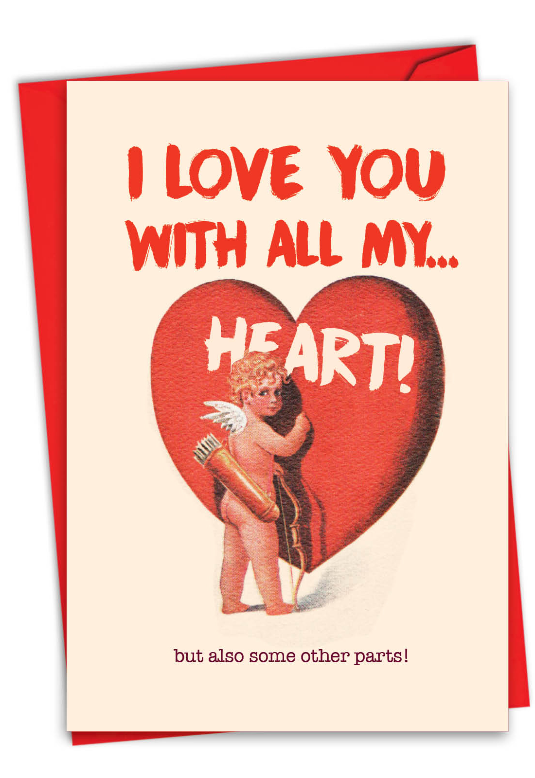 Dial up the desire, rachet up the risque, pump up the passion on Valentine's Day using the funny, feelgood, sexy V-Day card on sale here. If your beloved sweetheart likes the heat turned up when it comes to saucy, suggestive and sultry Valentine's Day greetings, then she or he will be burning with love upon receiving this funny, flirtatious and full-bodied February 14th missive. The torridly teasing greeting card displays a cute little cartoon Cupid, a whole lot of heart, and some provocatively hot wording.