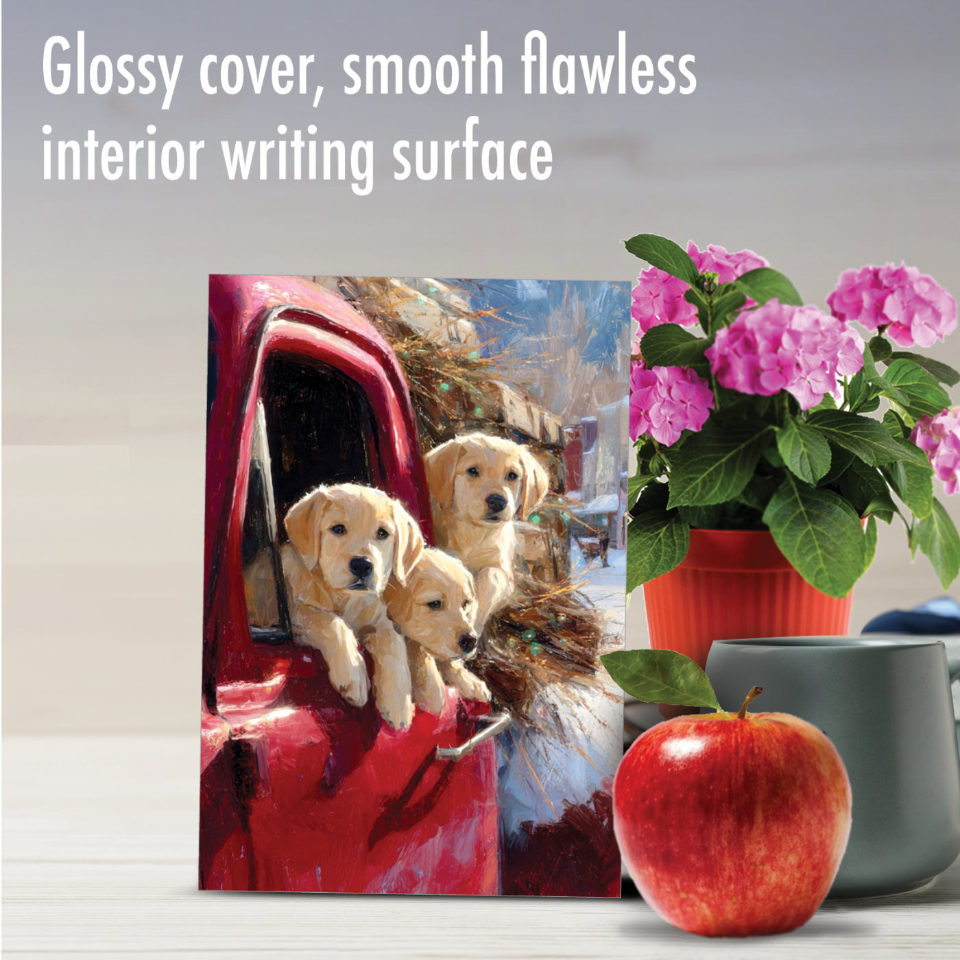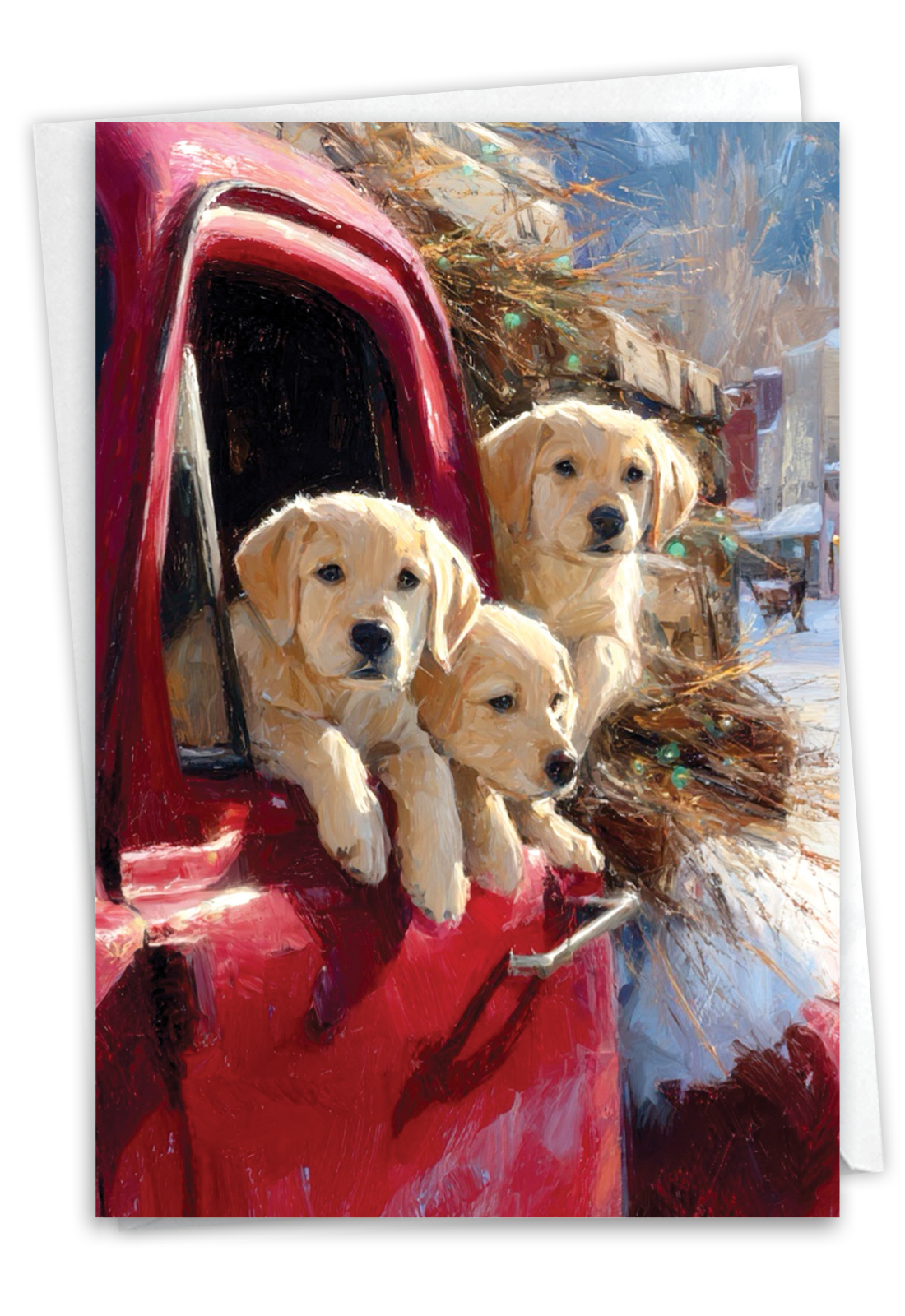 [illustration of yellow Labrador Retriever puppies in pickup truck]