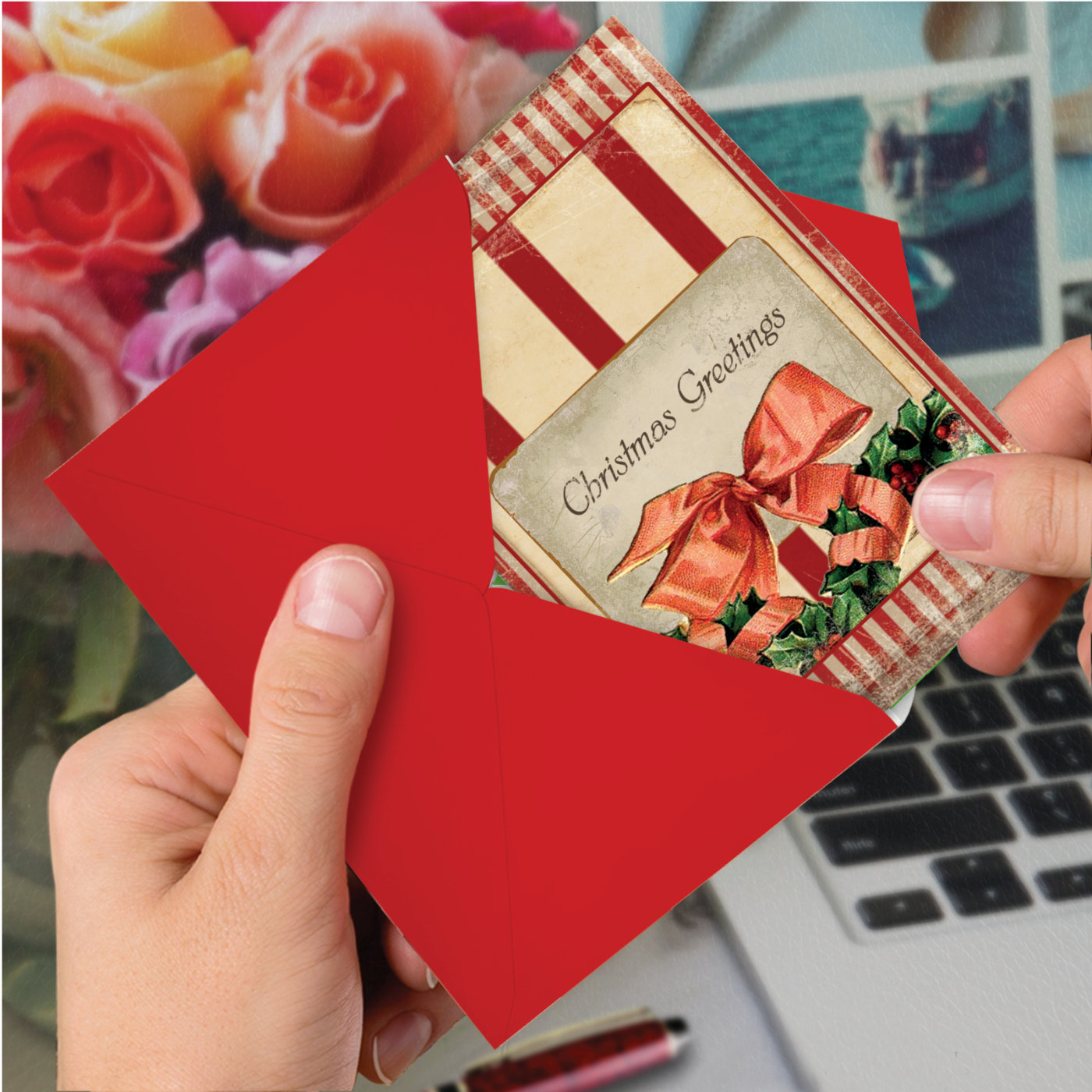Share an old-fashioned Christmas with the ones you love by giving them a beautiful Holiday Memories Christmas Card. This Holiday Memories Christmas Card features beribboned holly wreathes. This card offers a touch of classic Christmas elegance you simply won't be able to resist. The inside of the folded card is printed with 'Season's Greetings.' Write your own additional special holiday greeting or simply sign the card and let the beautiful exterior and simple message speak for itself.
