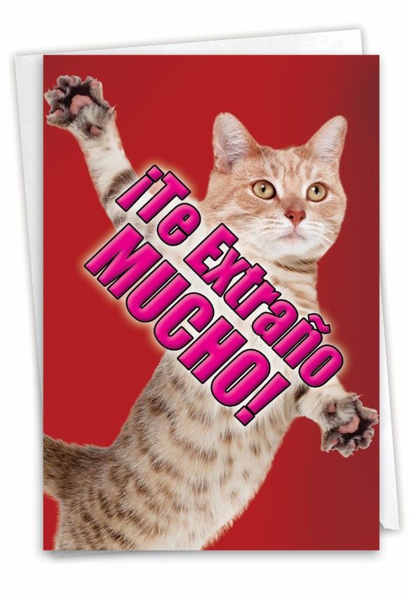Missing some special Latino or Latina, Mexican American or Puerto Rican, who is temporarily away from you? Well, show that super Hispanic friend, relative or workmate just "how much" you really do miss them using the cute, huge hugging feline Miss You card available for caring and sharing right here. Whether that wonderful Latin American you know and miss is a pussycat fancier or not, they'll get and love the adorable and endearing Miss You greeting which demonstrates and displays just how much you warmly and fuzzily think of them, and their absence.