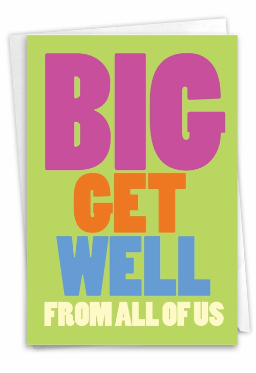 Send some really big, heartfelt Get Well sentiments with this Big Get Well Card from NobleWorks. Show just how MUCH you care that they're feeling better, from the whole gang. And who wouldn't feel better, after getting this BIG COLORFUL DOSE of a GET WELL CARD?