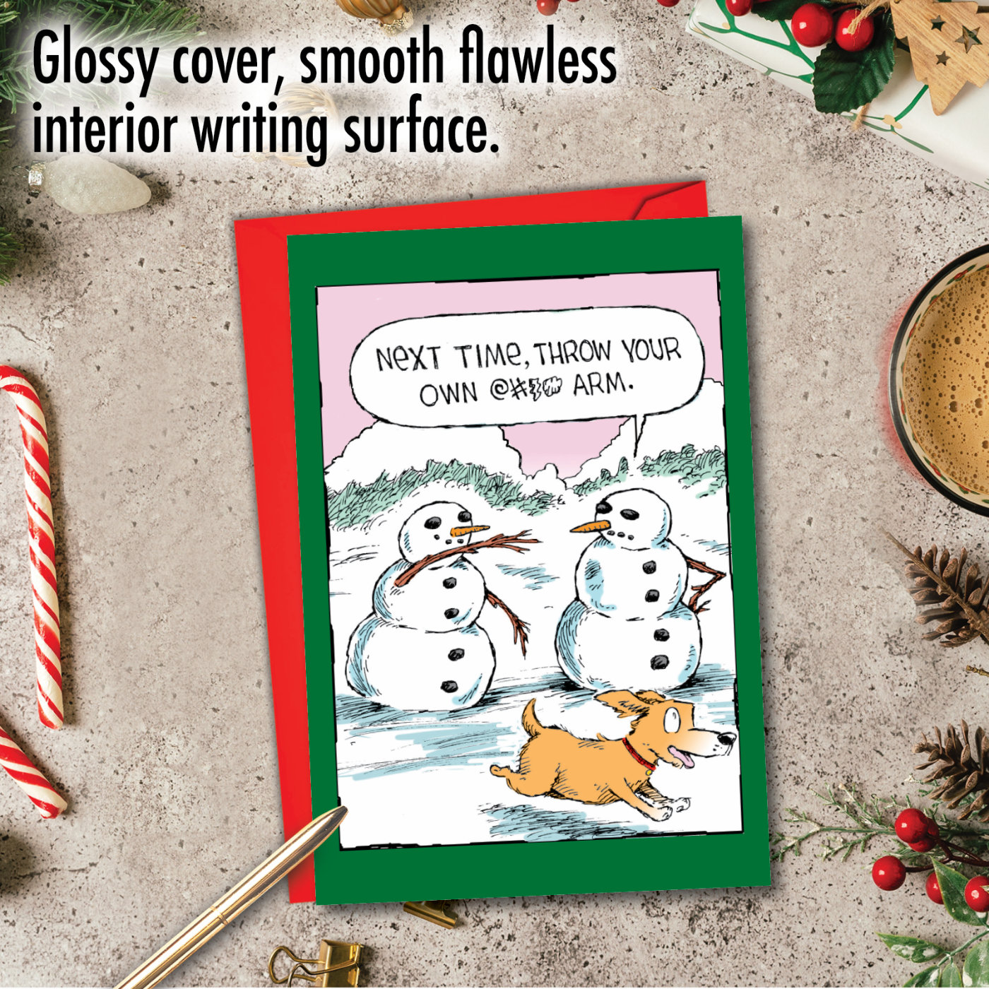 At NobleWorks Cards, this snowman arm Christmas humor card is one of a multitude of cards that are too funny for big-box retail stores or specialty gift stores. All those places have are the sappy, squishy seasonal style of cards. At NobleWorks Cards, you’ll find loads of hilarious cards that are either clean or dirty, so you can deliver laughs to your entire Christmas card list. We offer bulk discounts and free shipping to help reduce that holiday stress even more.