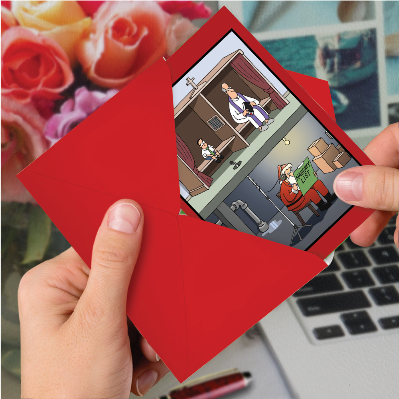 It isn't just the NSA that's monitoring people's private chatter. It's the big, fat, supposedly jolly guy in the bright red and white suit and black, buckled belt, too. Because, hey, Santa Claus doesn't just 'know' if some kid's been naughty or nice; he's actually got to get out and dig up the dirt or lack thereof by any means necessary. And if that involves bugging the sacred church confessional and eavesdropping in, then so be it. Cartoon illustrated in the vivid seasonal colors of red, white and green, this hilarious holiday card is mic'ed up for mirth and ready to be jerry-rigged out to anybody on your Xmas card list (or the unwitting subject of Kris Kringle's undercover spy operation).