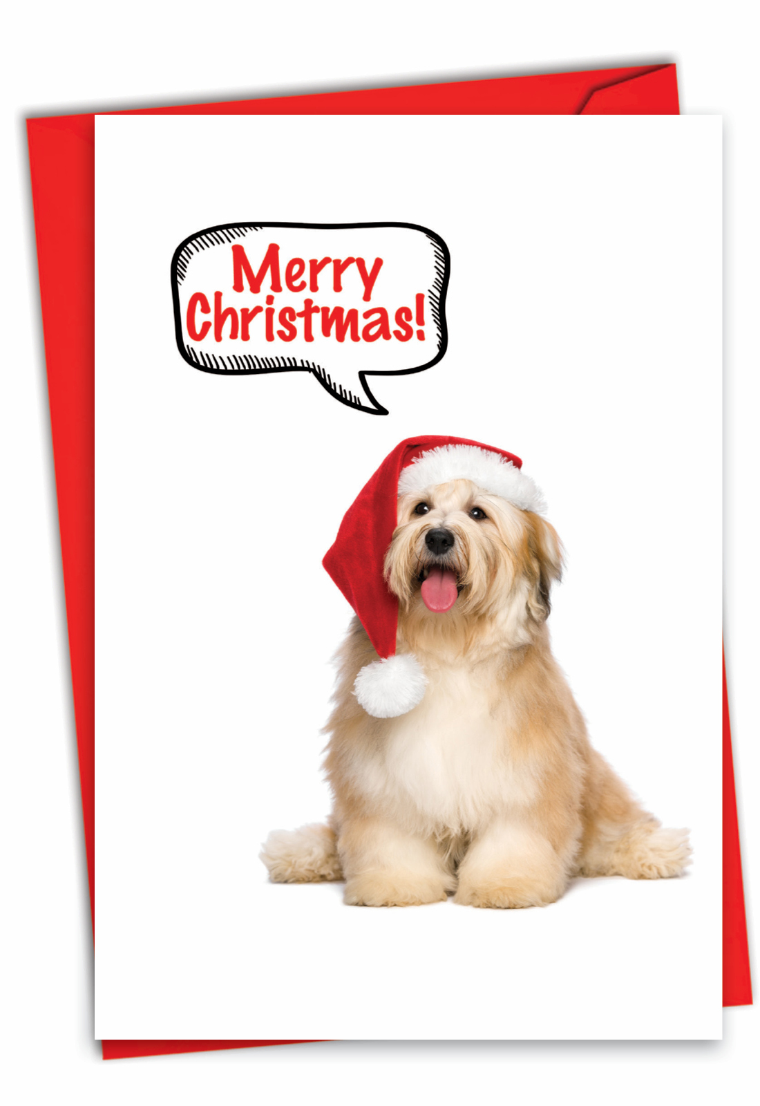 Just when you thought seasonal sentimentality couldn't get anymore warm and fuzzy … along comes this absolutely adorable, totally cute Yuletide yelper, delightful doggie card. Wearing a red and white festive Santa hat, a beguiling white and brown furred puppy is photo-captured barking out a big, cheerful, charming Noel greeting of best wishes and fine spirit. Hearts will melt, tears will flow, laughter will echo, and you'll be showered with petting praise when you gift one and all on your Holiday card list this darling dog merry and bright missive.