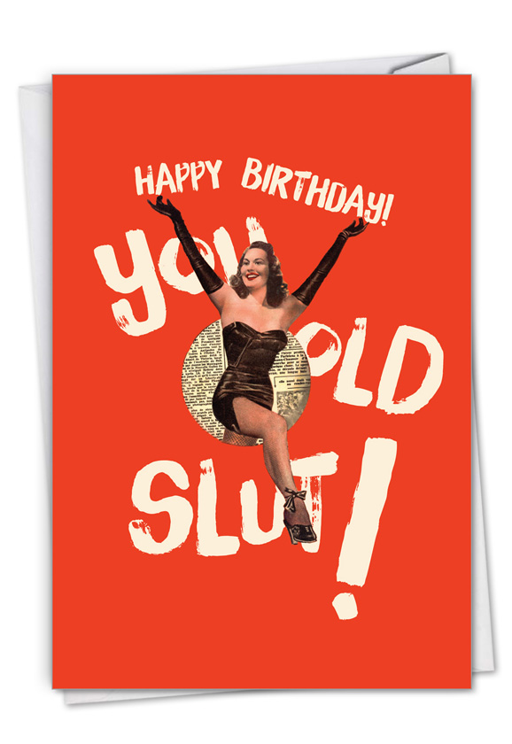 Stepping right off the front page of a newspaper, a beautiful, sexy woman in a velvet dress and gloves bursts onto the scene of this bright, fantastic, hilarious, crimson card, to wish some sensational aged slut a wickedly wonderful big B-Day! Any goodtime gal receiving this sassy, saucy, colorful card on her special day will be tickled pink, and scarlet. Lettered bold and brash, loud and large - just like the life of the delightful dame celebrating another birth anniversary.