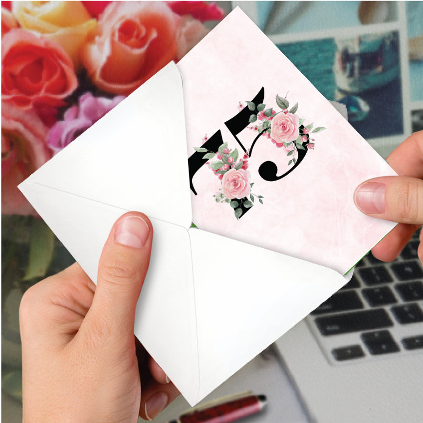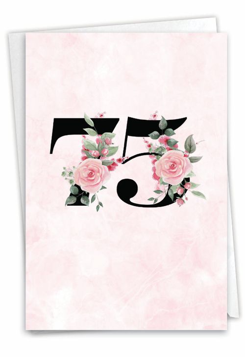 Turning seventy five years of age is a big deal! Truly worthy of a wonderful and rewarding Seventy Fifth Birthday card to mark the awesome lifetime achievement. That epic, well aged friend or family member of yours who's hit the big 7 5 will be feeling even better about him or herself when you gift them the glowingly gorgeous, gloriously flower filled 75th Birthday greeting available here. A rosy, leafy, lovely tribute to a remarkable longevity accomplishment, and person!