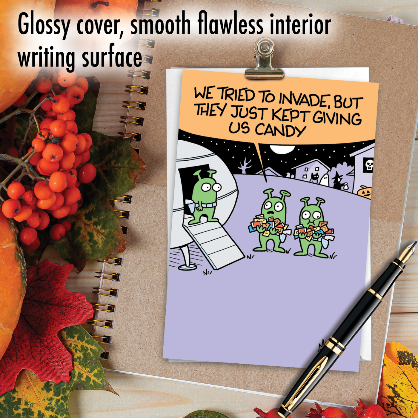 Yep, October 31st is definitely "not" the best date to schedule a little green alien invasion of planet Earth. But All Hallows' Eve is a great time to add to anyone's Halloween fun, amusement and delight by treating them to the humorous outer and out of touch space invaders greeting card available here. The cute, comic, candy loaded imagery and clever joke captioning will probe everyone's funny bone, in a good way, be a true terrestrial treat, on Halloween.