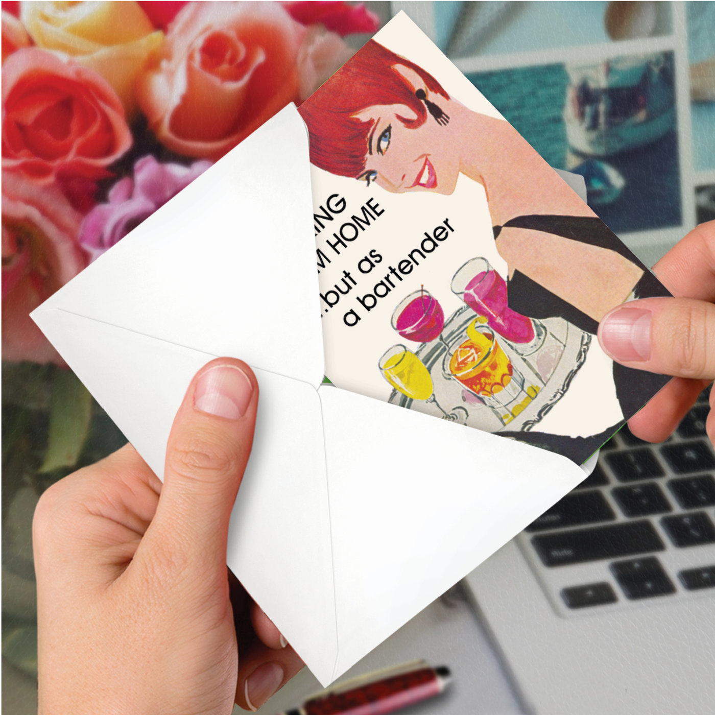 Almost everybody seemed to be working from home during the COVID pandemic. But hardly anyone got the plum job of being a house bartender. The beautiful, blue-eyed redhead on this cheers to a Happy Birthday card did, however, and she's on-call to serve up some bubbly hilarity, brimming best wishes and fine high spirits to any friend, relative or onsite or offsite coworker of yours celebrating their big birth anniversary.