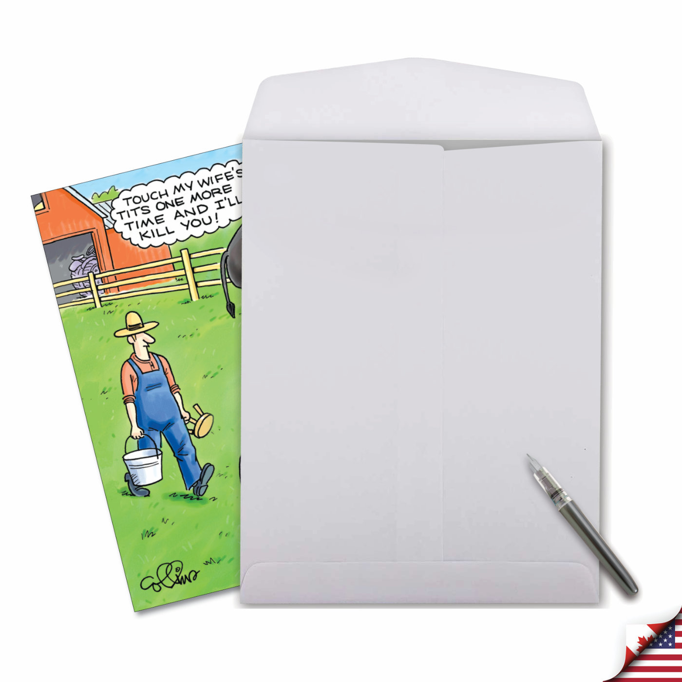 This Jumbo Size Birthday Funny Card sends out huge Happy Birthday greetings – no bullshit about it. Pastoral setting, barnyard animals ... and a bull-built male in heat and a great set of teats! What more could any birthday boy or girl want on their special day!?