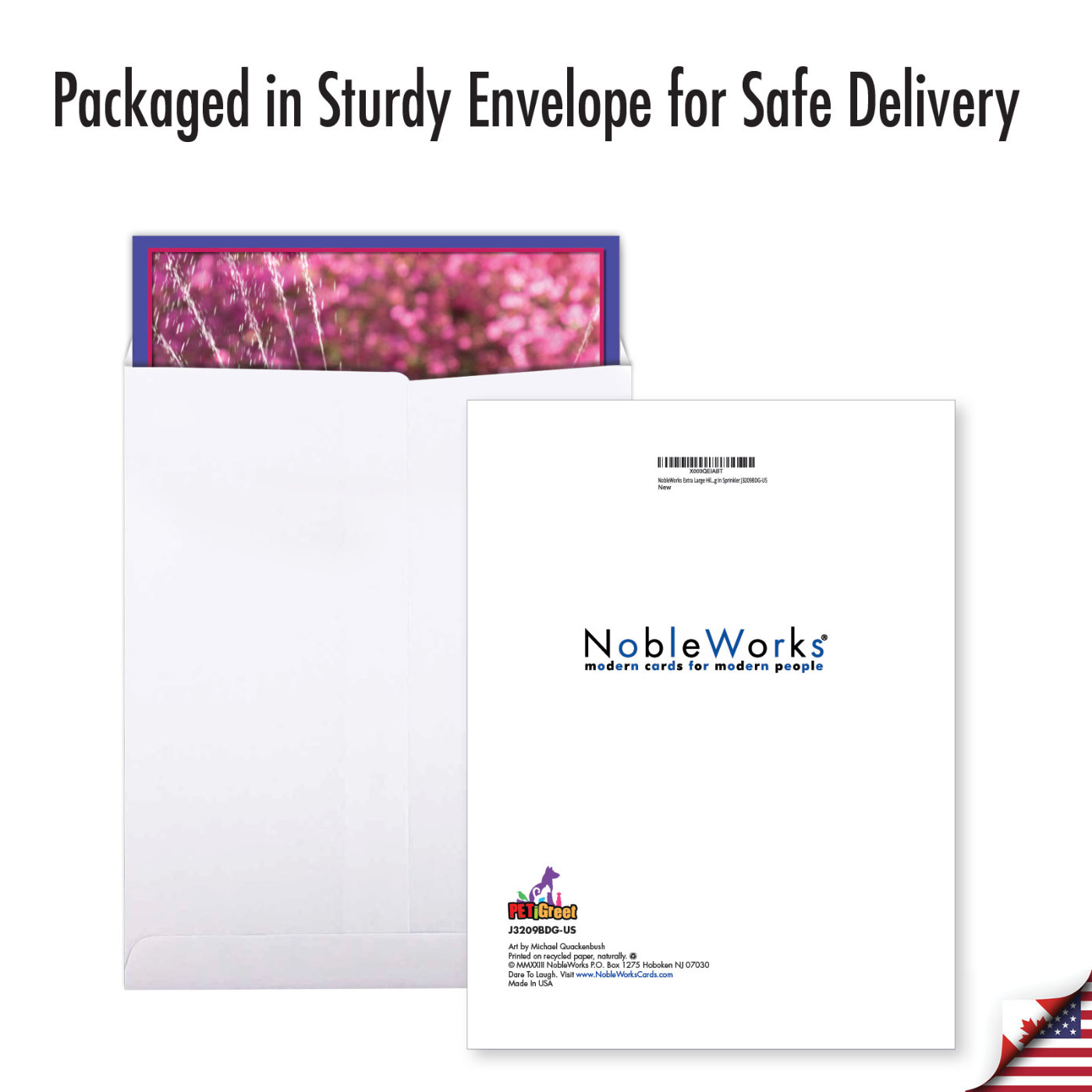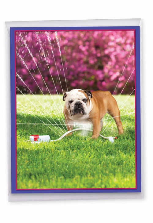Is the mutt pictured here in heat? Or just experiencing another epic hot flash at its advanced age? Either or any way, this cute, colorful, wet, wacky, funny pooch giant card will turn up the gigantic good cheer at anyone's big Birthday party. A brown and white bulldog is hugely humorously pictured basking in the cooling waters of a lawn sprinkler, on green grass, with a bright pink flowered bush in the background.
