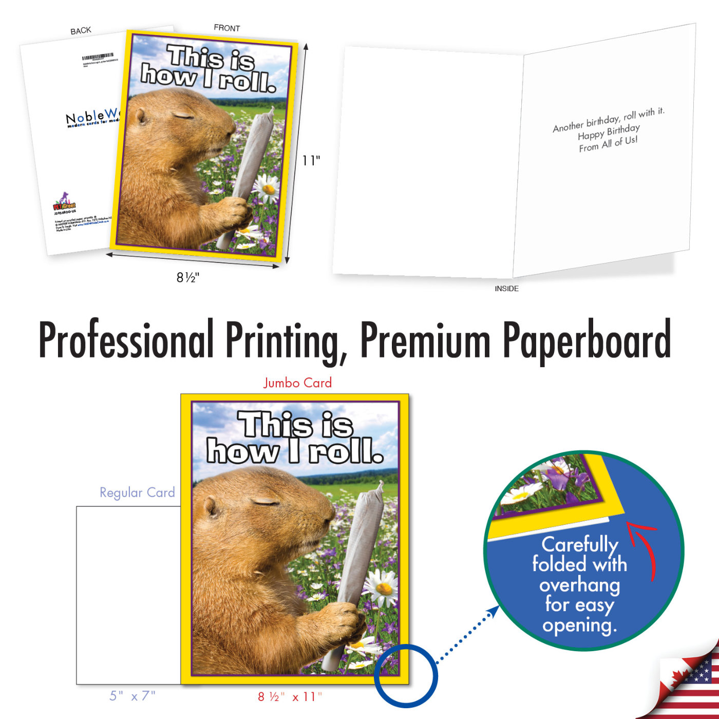 Get high on big laughs and "go fer" the funnybone with the huge How I Roll Birthday Humor Card available at NobleWorks Cards. Find out why the gopher in this giant card from the PetiGreet product line is feeling so epically mellow. This irreverent gargantuan greeting card is printed in the U.S. on paper recycled from mixed sources. This is an extra large card that nails the funnybone right in its "joints." Available with free shipping, the How I Roll funny gopher birthday gigantic card is offered with NobleWorks Cards' bulk rate pricing. Fire it up and out to close and budding friends, family members and coworkers.