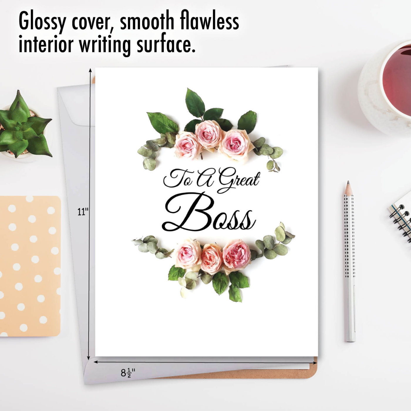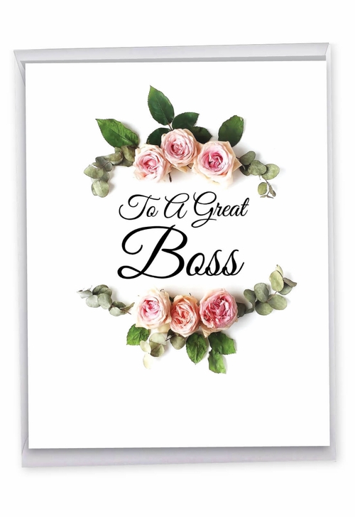 Pink and red roses with green leaves and vines frame the big, black scripted words "To A Great Boss" on this lovely, giant card. Stunningly set against a white background, the beautiful roses highlight the super words of applause. The special supervisor/manager receiving this wonderful, enormous gratitude card will be deeply appreciative. Hugely heartfelt and epically elegant.