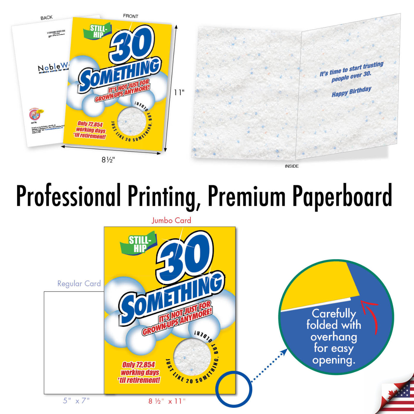 Still hip and awesome, that thirty-something birthday guy or gal needs to be reminded that it's time to start trusting folks again. With only 72,854 working days 'til retirement, this big, funny, clean, colorful birthday greeting reminds them that they're getting older ... and hopefully, better.