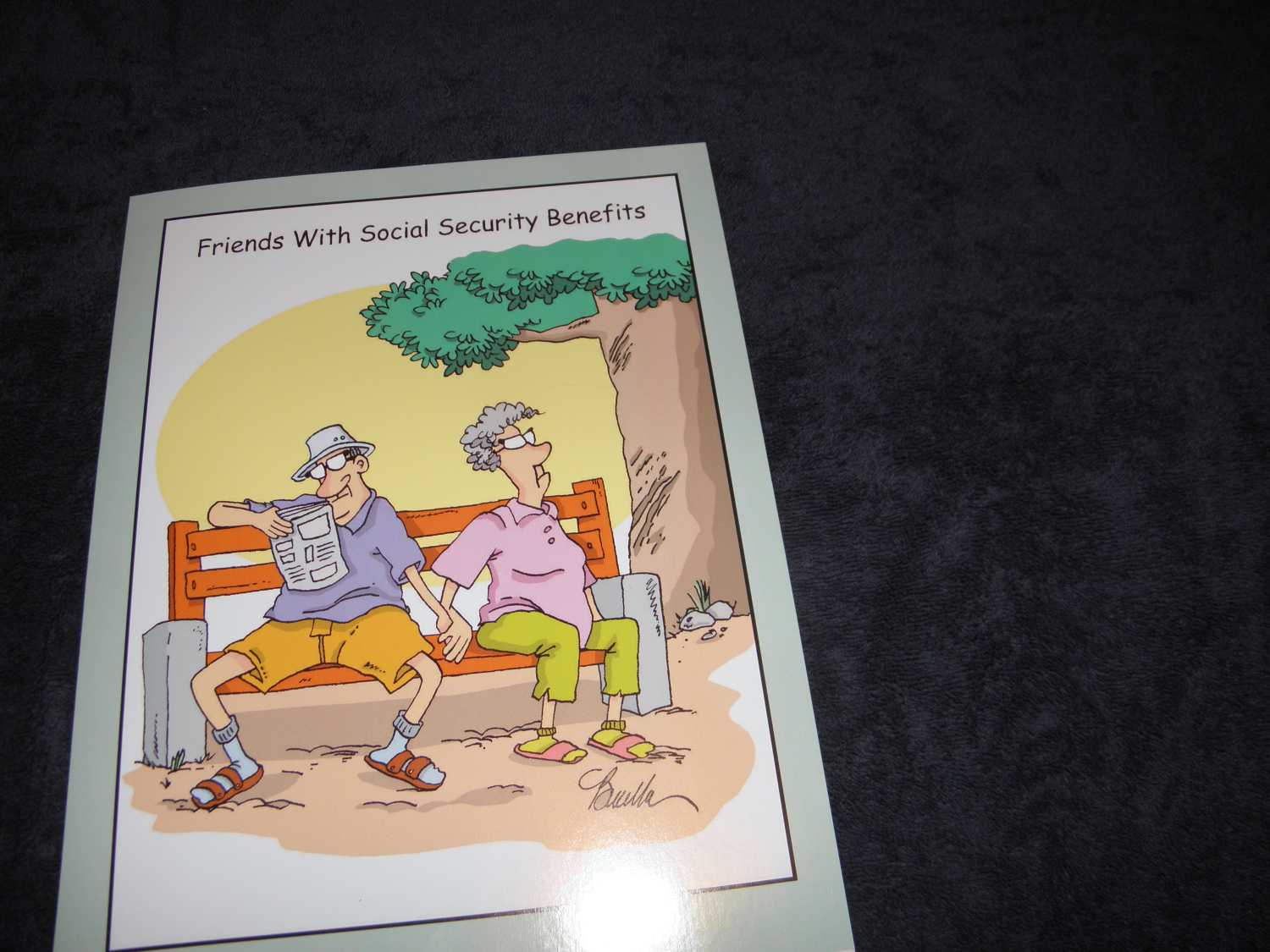 Hey, when you're a senior living on a fixed income, sometimes it makes epic smart sense to pool your pension with someone of the opposite sex - and if you can have some super sex on the side, all the better. Two sexy, colorful, sandaled old-timers hilariously hold hands on a big park bench, marking and making time with one another to their mutual money and monkey business B-Day large benefit. Old friends are the best friends, after all; and if they have some cash and carnal appetite left, hallelujah!