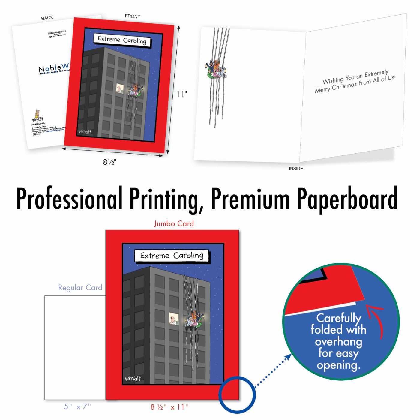 Who knew Xmas caroling could be so intense!? Not content to just safely stroll down the neighborhood streets making with the seasonal songs, warbling for money and good cheer, the Yuletide yodelers on this huge, clever, colorful, cartoon card are rappelling down large buildings to ensure that office shut-ins get the enormous benefits of their stretched vocal cords. Now that's some epically radical holiday spirit! Give the gift of high-larious, free-dangling, musical mirth and merriment by scaling out this awesome aural card to all those on your holiday massive missive list.
