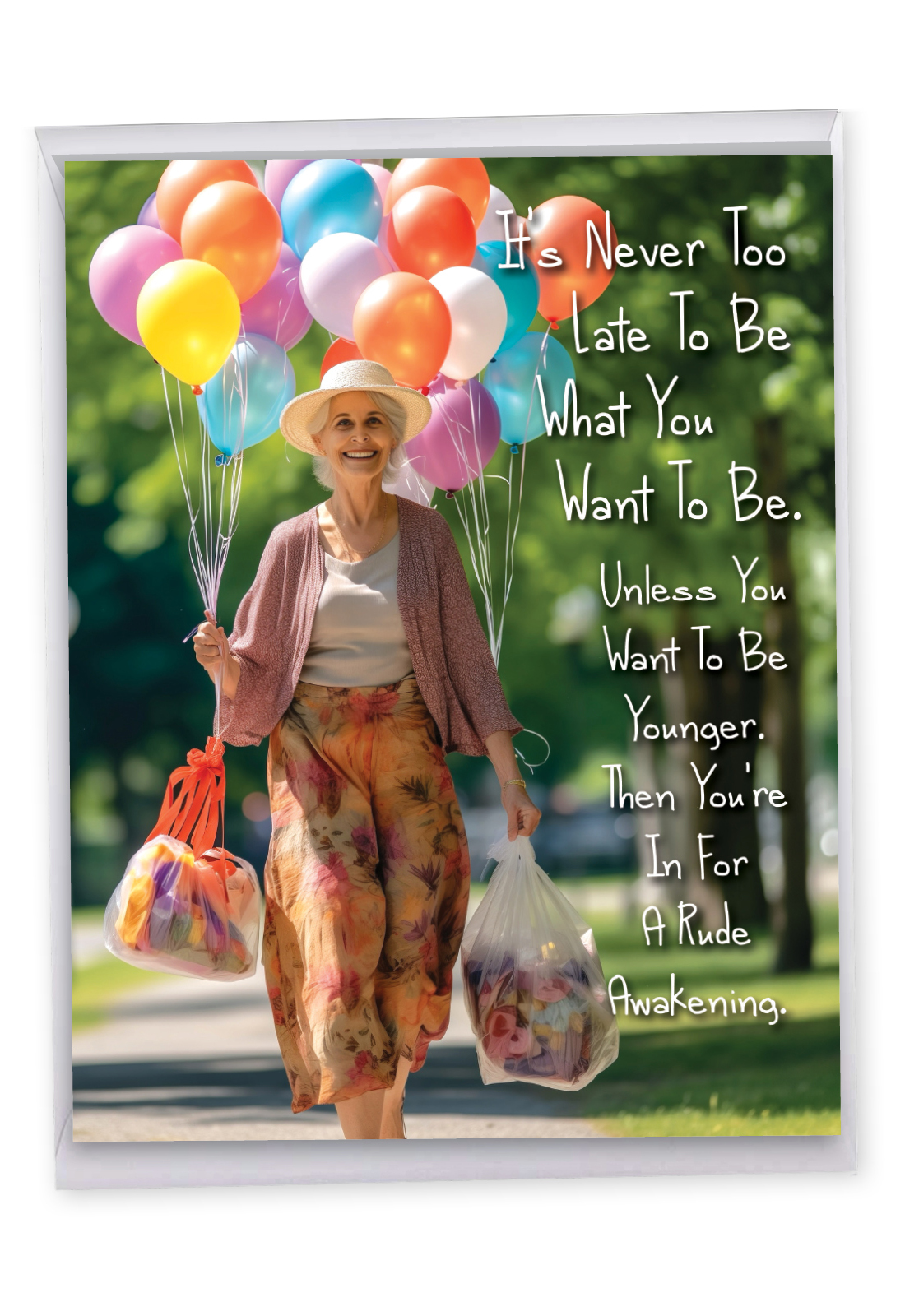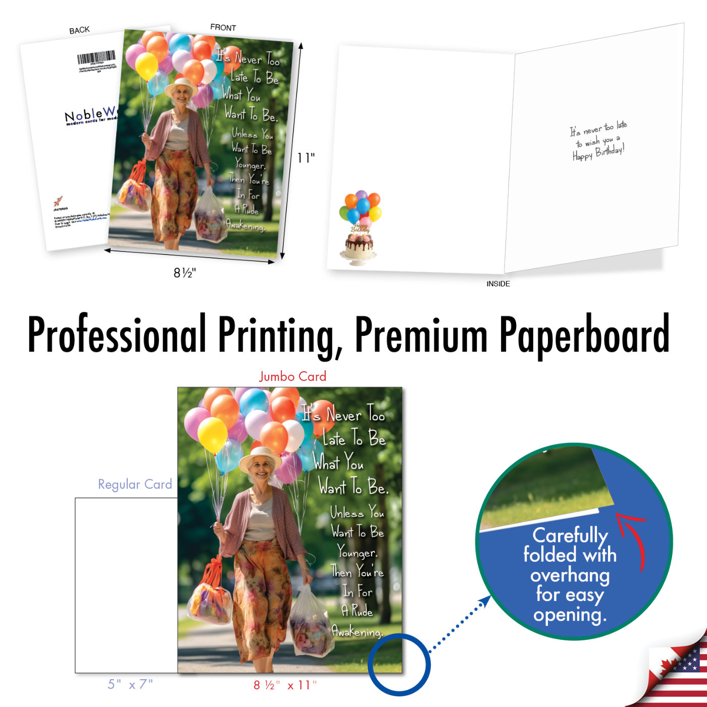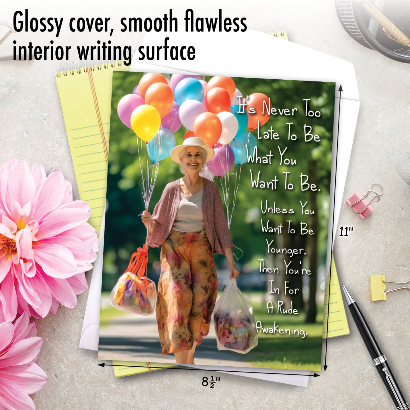 Never Too Late Lady: Humorous Birthday Over-sized Paper Greeting Card