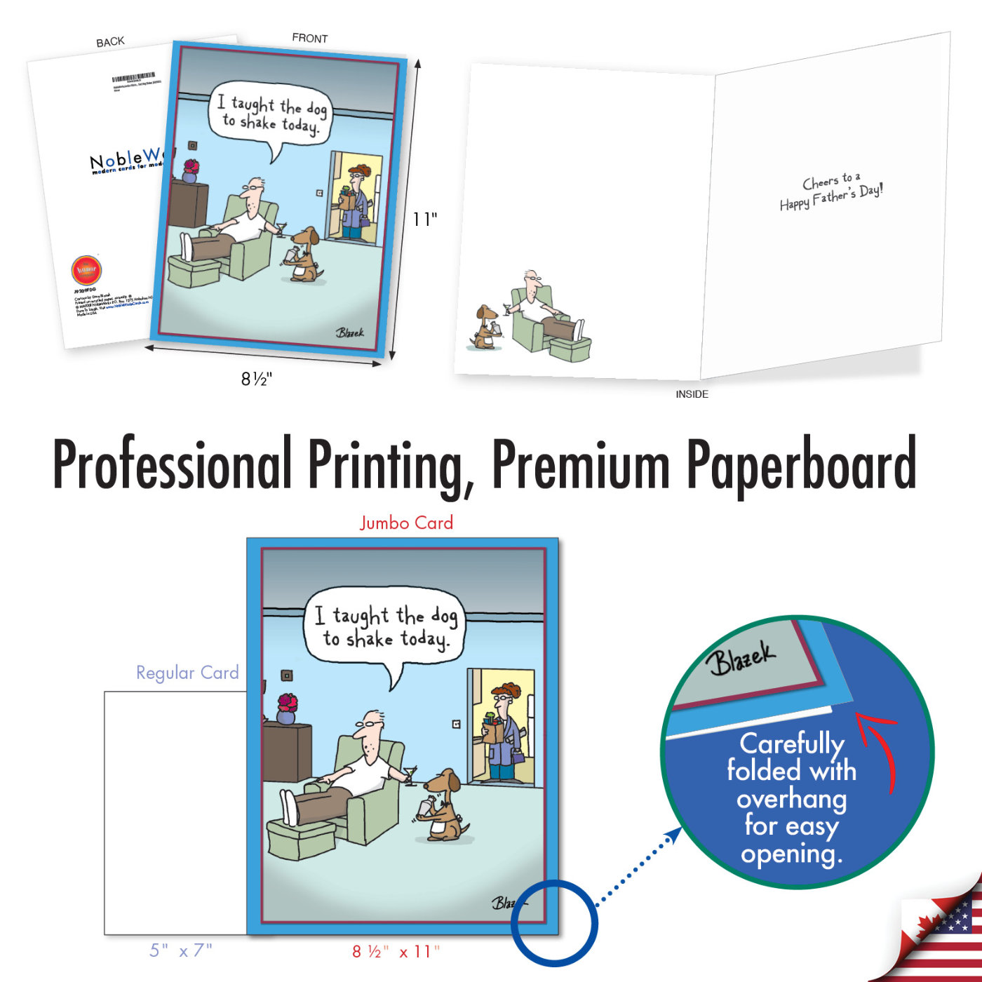 Does your dad like his martinis shaken, not stirred? And served to him by the furry mutt family pet? Even if he somehow doesn't, Pop will still get an epic warm glow and huge heady buzz when you present him with this hilarious highballing hound Father's Day giant card. A jigger of great laughter and good cheer on his grand day of enormous celebration is just what Papa ordered, and you and the well trained bar dog tremendously served up.