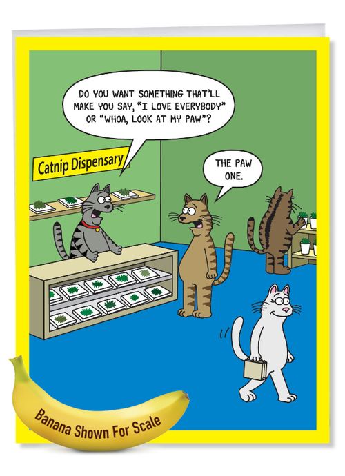 If you thought felines acted all aloof and uninterested before … well, now that they've legalized catnip in a number of states and countries, just look at the results! Furry, hilarious results - as delightfully depicted and wittily worded on this huge, happy cat Birthday card. Cute kitty and wacky tobaccy lovers alike, and everybody else with a sense of humor celebrating a big B-Day, will light up with great good cheer and spark up with epic laughter when you roll them out this giant, hysterical cardboard cartoon extra-large joint in honor of their big special day.