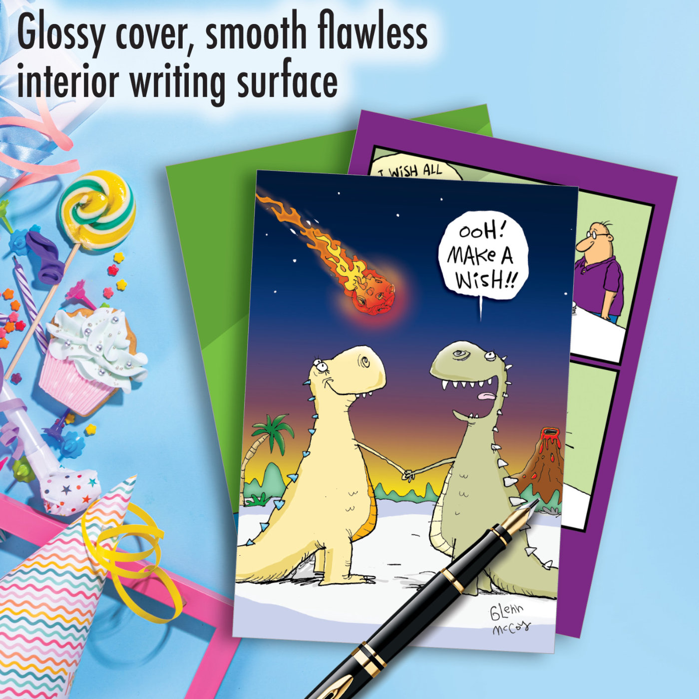 When you wish upon a … meteor, you just might end up as dead as a dinosaur. But happy, long living, good and funny Birthday wishes are what the three cards in this hilariously hoping collection will deliver to one and all celebrating turning another year older. Kids and adults, family and friends, neighbors and colleagues, wives and genies, dogs and dinos, will all get a cheery laugh out of any one of the magically mirthful missives available here all together. So, don't just dream about selecting and sending them out - do it, and you'll be making some trio's wish for a hysterically Happy Birthday come true.